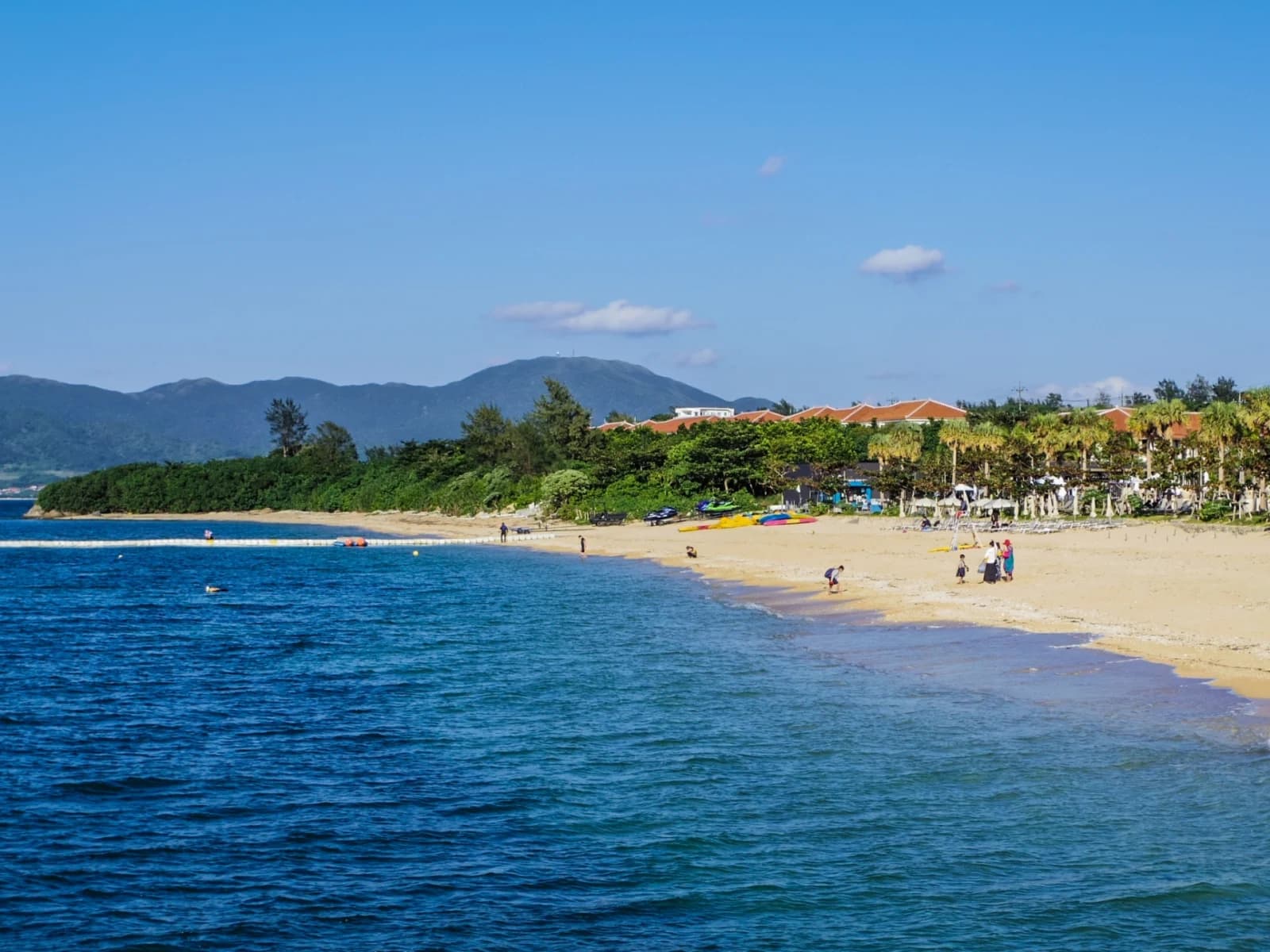 A beach stretching in front of Fusaki Resort, with a stunning sunset view from the pier. Jellyfish nets and facilities are well-maintained, making it safe for families with small children.